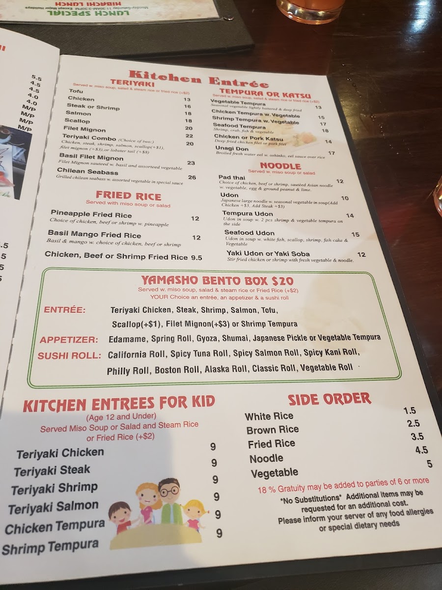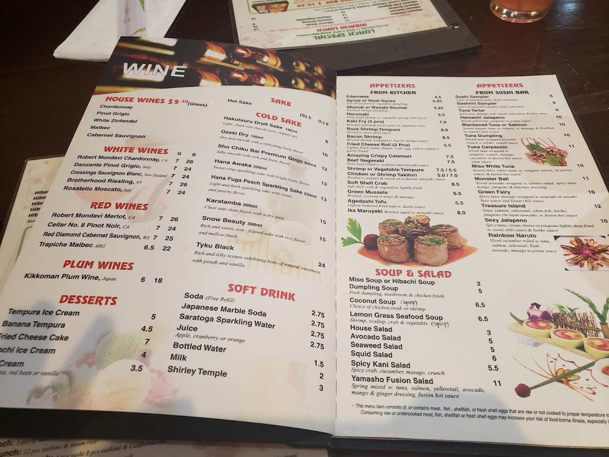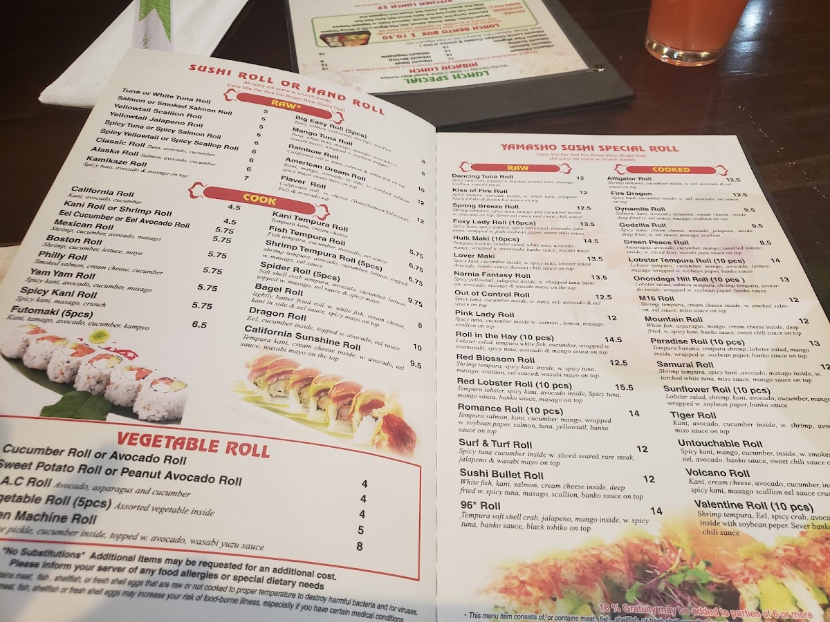For those craving a cooked option, the Yamasho Special Rolls, like the flavorful Valentine and Volcano Rolls, present exceptional fusion of textures and tastes. Pair your meal with our hearty noodle dishes, such as Lemon Grass Seafood Ramen or Tempura Udon, both served with miso soup or salad for a complete dining experience.